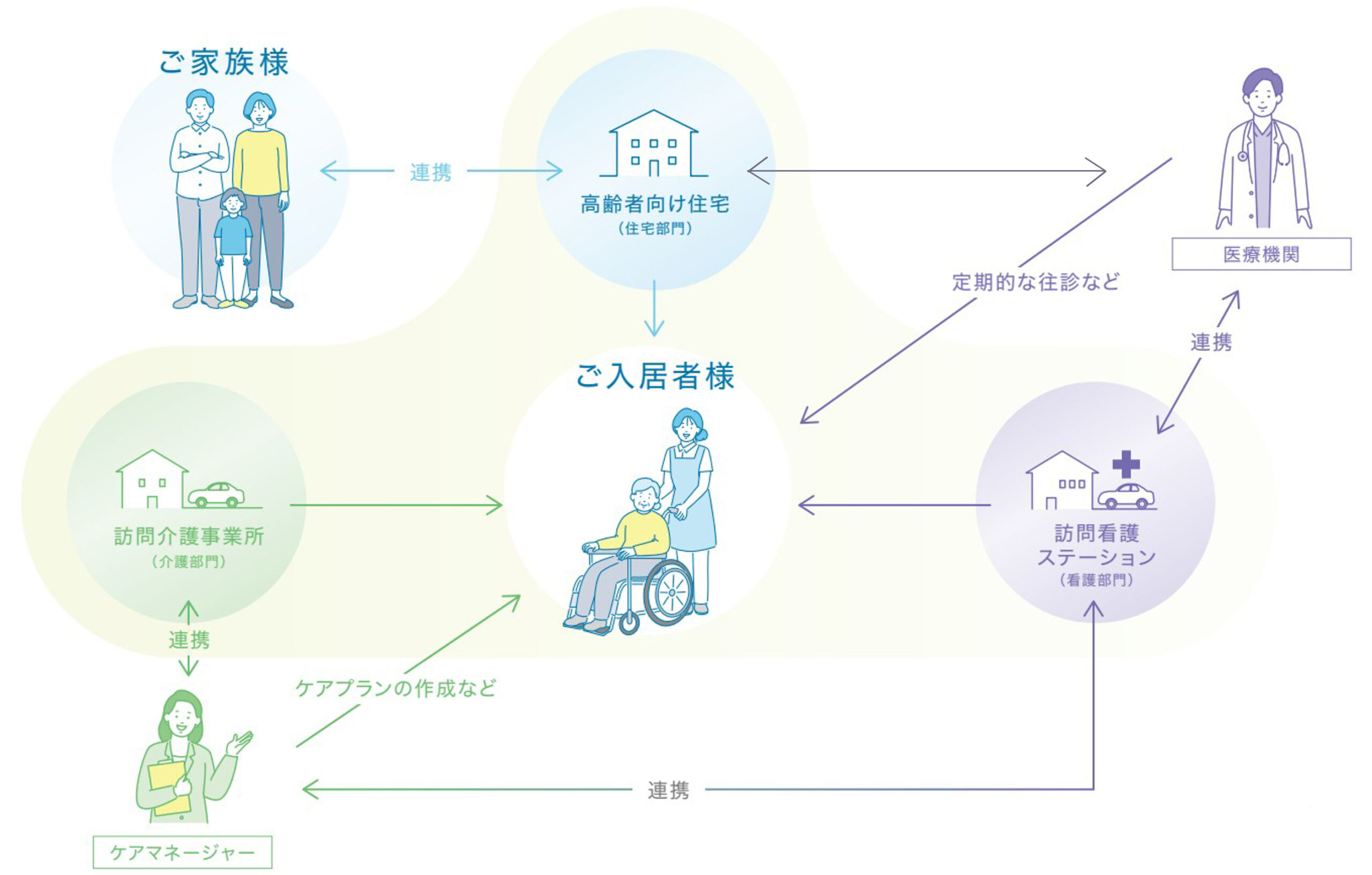 事業所と事業所が連携し、お一人お一人のご入居者様を包み込む。新しい暮らしの提案。